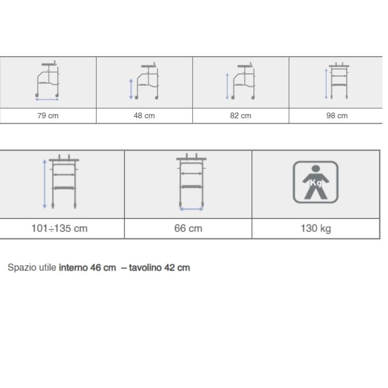 Ruote: 4 piroettanti Ø 10 cm, con freni posteriori a leva